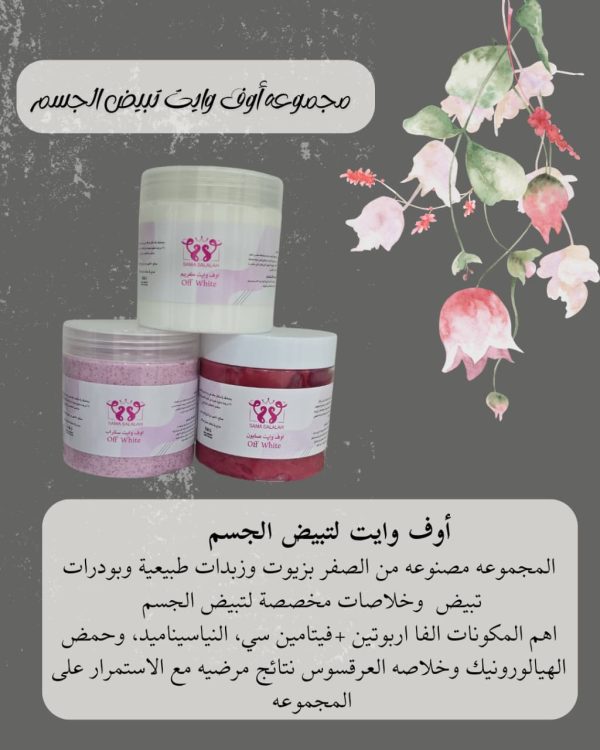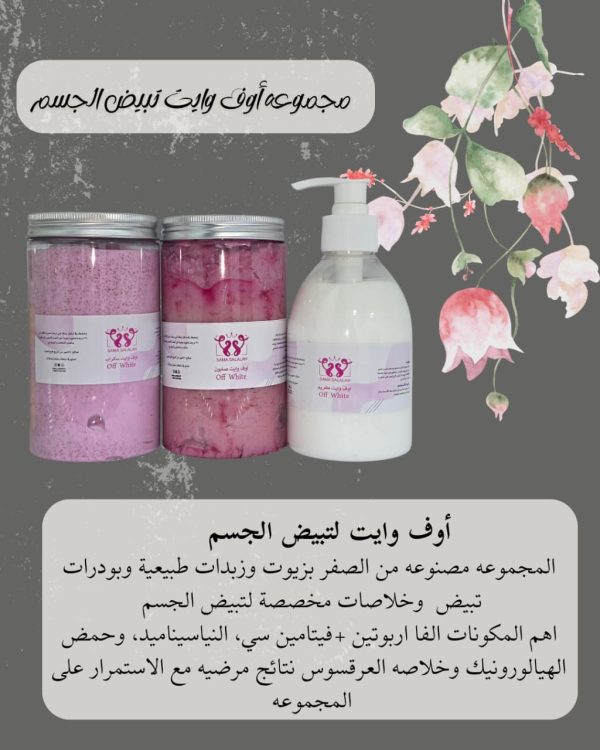 أوف وايت لتبييض الجسم المجموعه مصنوعه من الصفر بزيوت وزبدات طبيعية وبودرات تبيض وخلاصات مخصصة لتبييض الجسم اهم المكونات الفا اربوتين + فيتامين سي، النياسيناميد، وحمض الهيالورونيك وخلاصه العرقسوس نتائج مرضيه مع الاستمرار على المجموعه ٥٠٠ مل