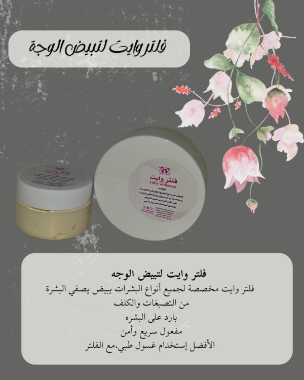 فلتر وايت لتبييض الوجه فلتر وايت مخصصة لجميع أنواع البشرات يبيض يصفي البشرة من التصبغات والكلف بارد على البشره مفعول سريع وأمن الأفضل إستخدام غسول طبي مع الفلتر